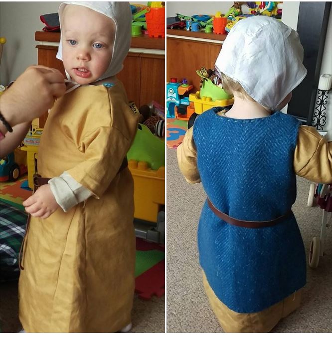After a few painstaking hours he now is the proud owner of a new linen shirt, a yellow linen dress, a blue woolen over dress or surcoat, a thin leather belt and a linen coife. Doesn't he look adorable!?