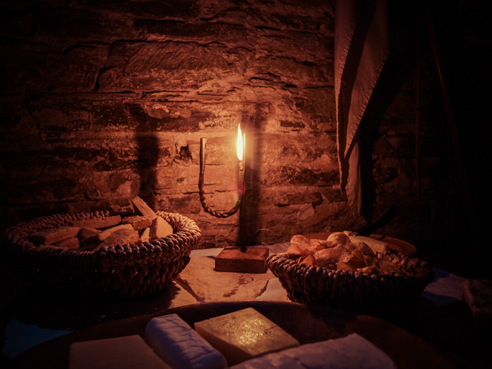 Picking and preparing rushes to be used as lights is a lengthy and delicate process whereby the dried rushes are run through the leftover animal fat from the Cooks tent. Once dried again and lit the fat soaked rushes burn slowly, like a primitive candle, giving a light source for the dark evenings.